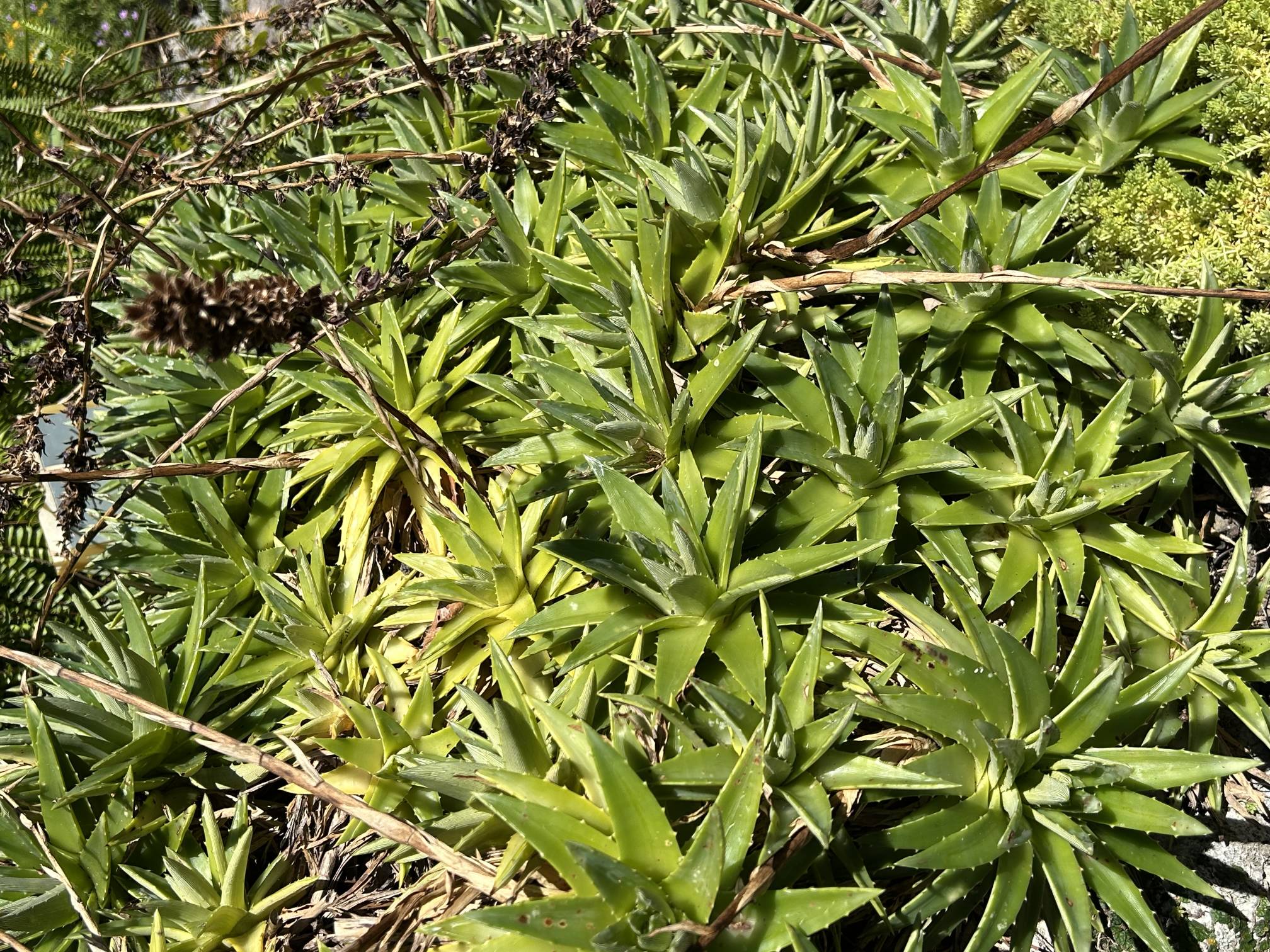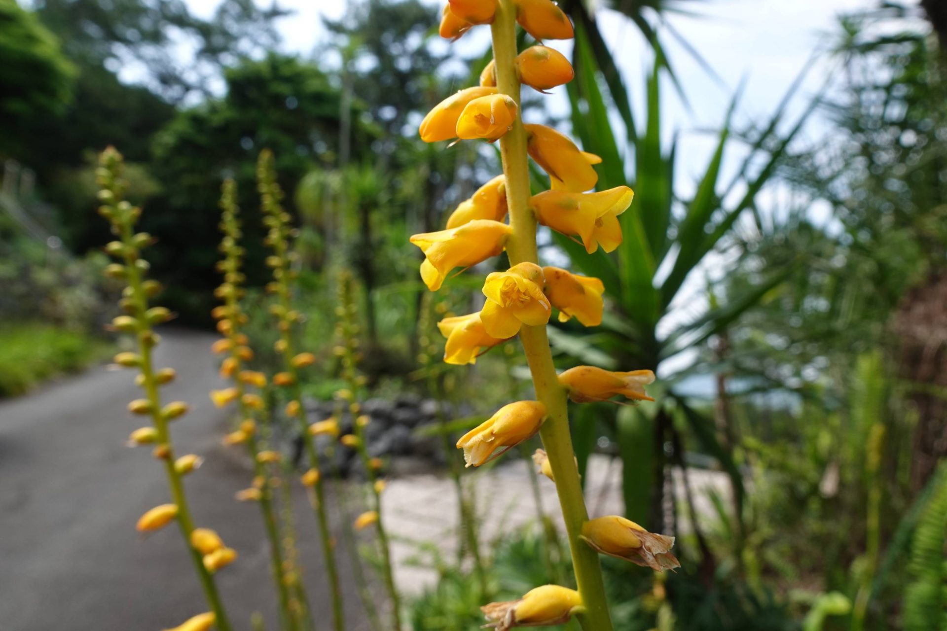 解説 | シマケンザンは、ブラジル中部以南に自生するパイナップル科ディッキア属の多肉植物です。葉は長三角形で非常にかたく、長さ8~10cm、幅2cm前後、葉表は鮮緑色で光沢があり、葉裏は縞があります。葉の縁には白く鋭い牙状の鋸歯があり、全体の葉姿が剣山のように見えることが和名の由来になります。当園の露地栽培では、5~7月頃になると、葉間から花茎を真っ直ぐ50~60cm程伸ばし、長さ30cm前後の穂状花序に、鮮黄色の花をたくさん斜め上に向かって咲かせます。 |